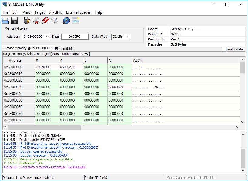 Linking results in an ELF (executable and linkable format) file. Using the arm-none-eabi-objcopy tool included in the GNU ARM Embedded Toolchain, the ELF file is converted to a binary file (out.bin). The binary file can then be "flashed" to the STM32F411 development board using a tool like the STM32 ST-Link Utility. The bin file is examined farther below, but first let's discuss each of the source files.